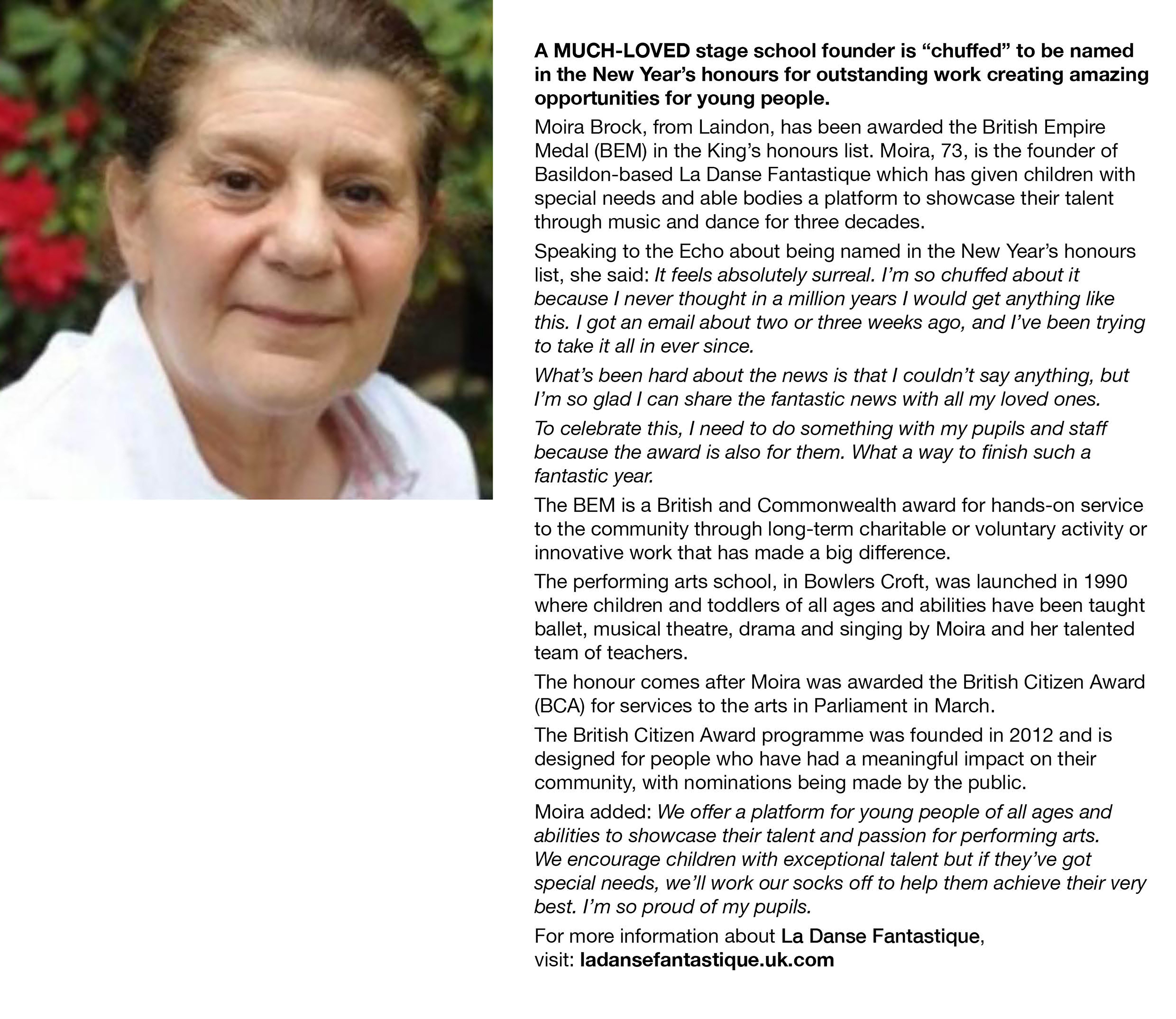 Congratulations to Moira who has been awarded a bem in the Kings Honours List
